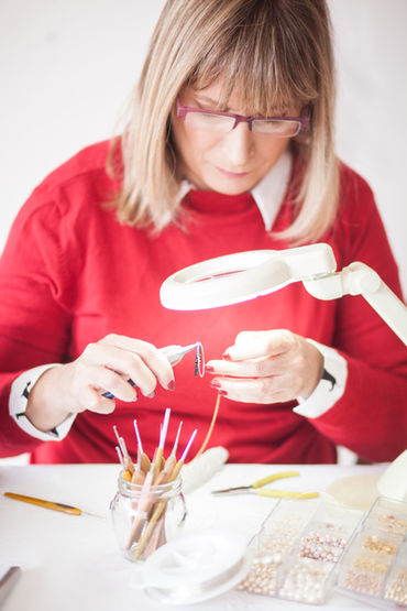 אני יוצרת תכשיטים עדינים בעבודת יד, בטכניקת סריגה בחוטי זהב שעוברת במשפחתי מסבתא שלי.